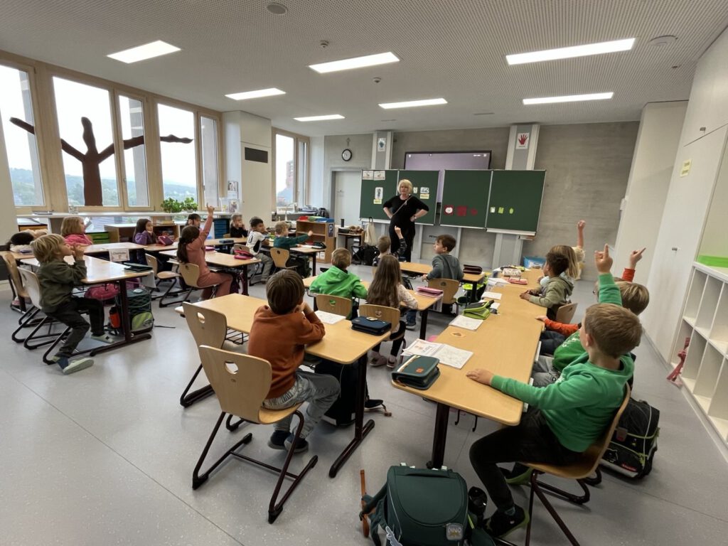 Außerdem haben die Kinder die Schulumgebung kennengelernt und das sichere Überqueren der Straße am Zebrasteifen sowie an der Fußgängerampel geübt. Inzwischen wissen alle, in welcher Religionsgruppe sie sind, und knüpfen dort neue Bekanntschaften. Zu den Lieblingsfächern zählen Werken und Gestalten, Sport und Schwimmen. Sicherlich werden in den nächsten Wochen noch viele neue Erfahrungen hinzukommen, auf die wir gespannt sind.