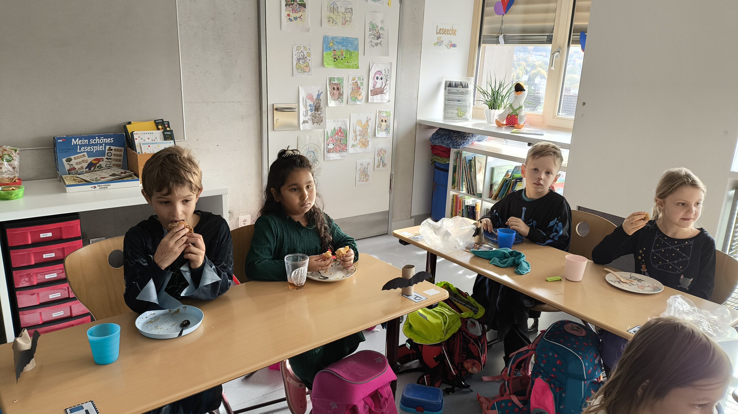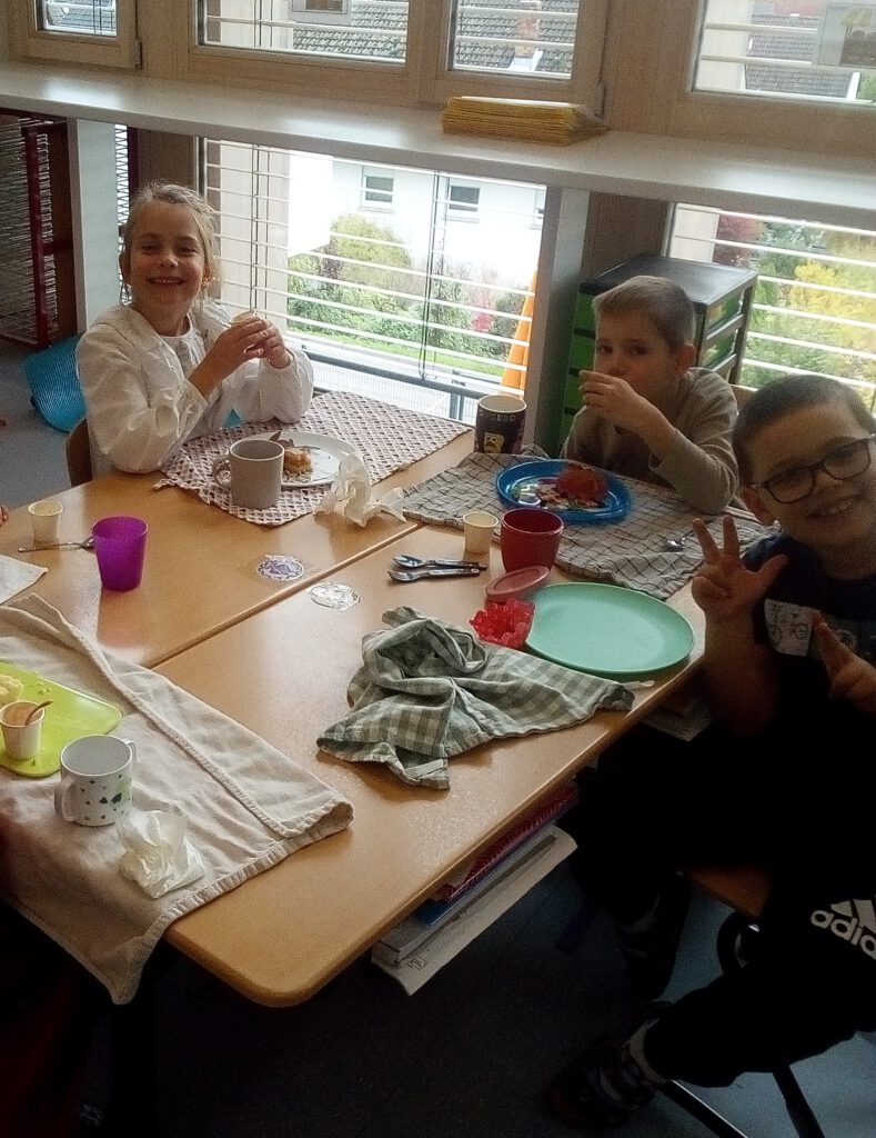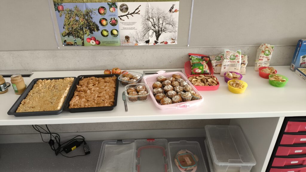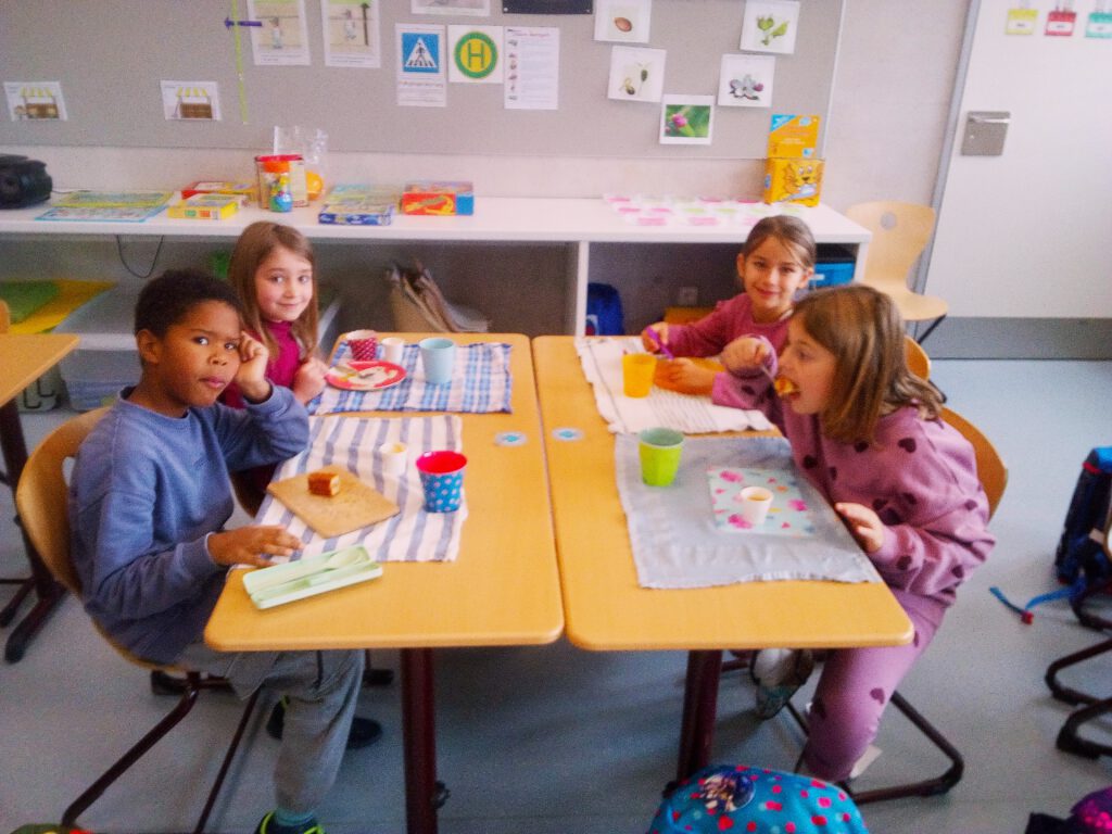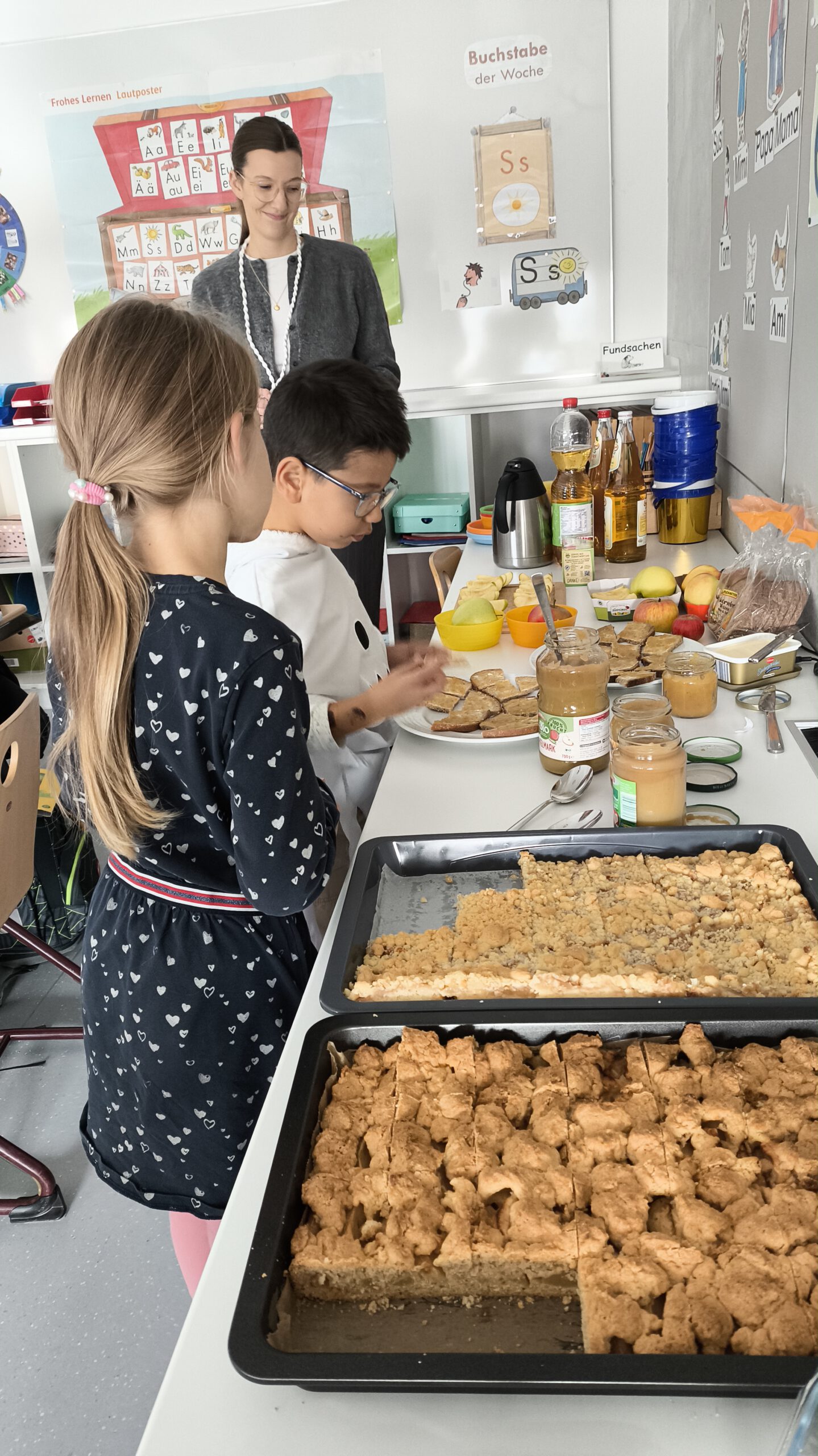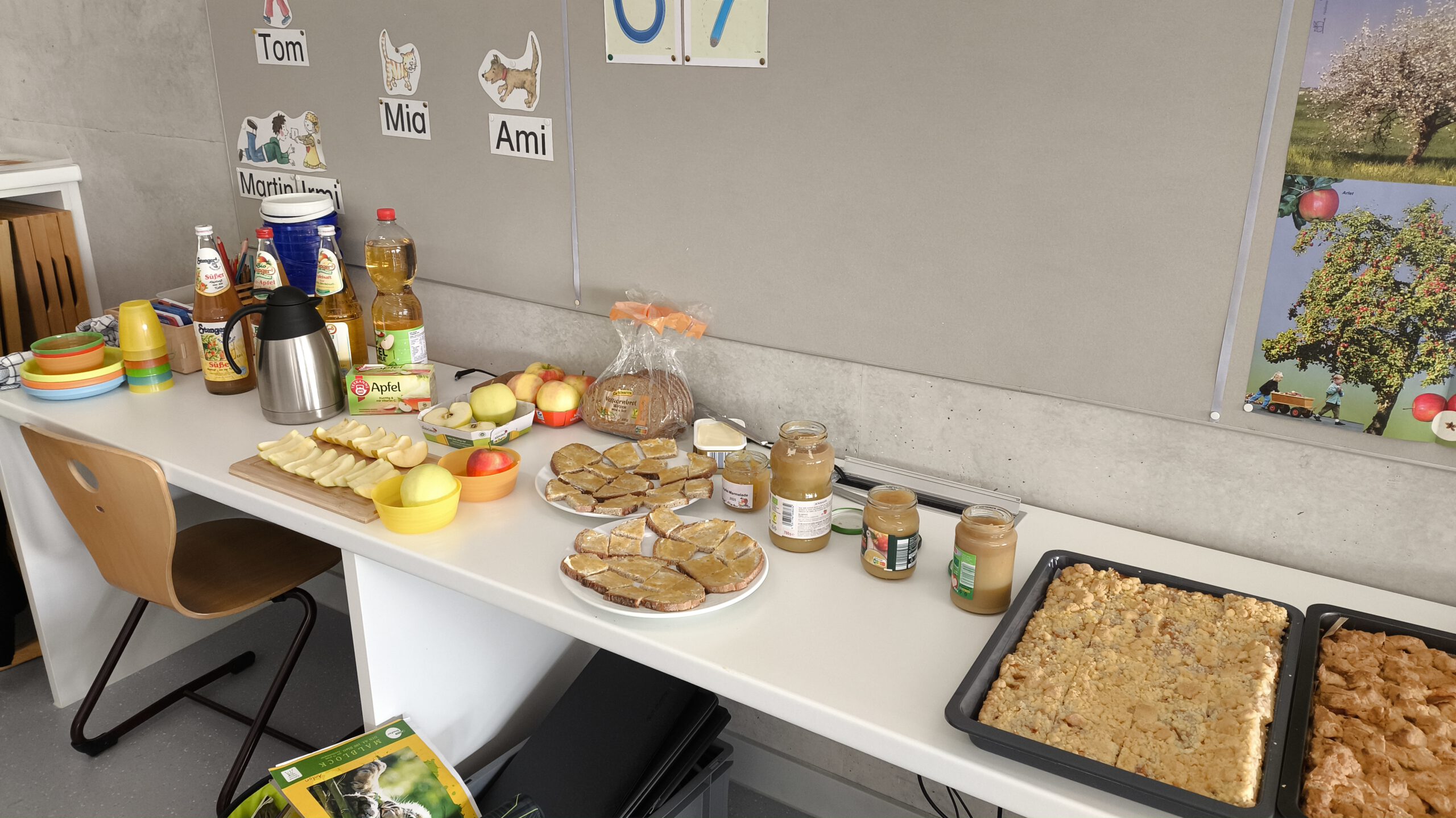 Dass man aus Äpfeln auch viele leckere und abwechslungsreiche Produkte herstellen kann, durften die Kinder schließlich bei einem Apfelfrühstück selbst ausprobieren. Die Schüler brachten viele Spezialitäten mit in die Schule. Neben Apfelkuchen, -marmelade, -mus und -chips gab es auch verschiedene Apfelsäfte und Apfeltee. Besonders beim Apfelmus, bemerkten die Kinder, dass dieses auch ganz unterschiedlich schmecken kann.
