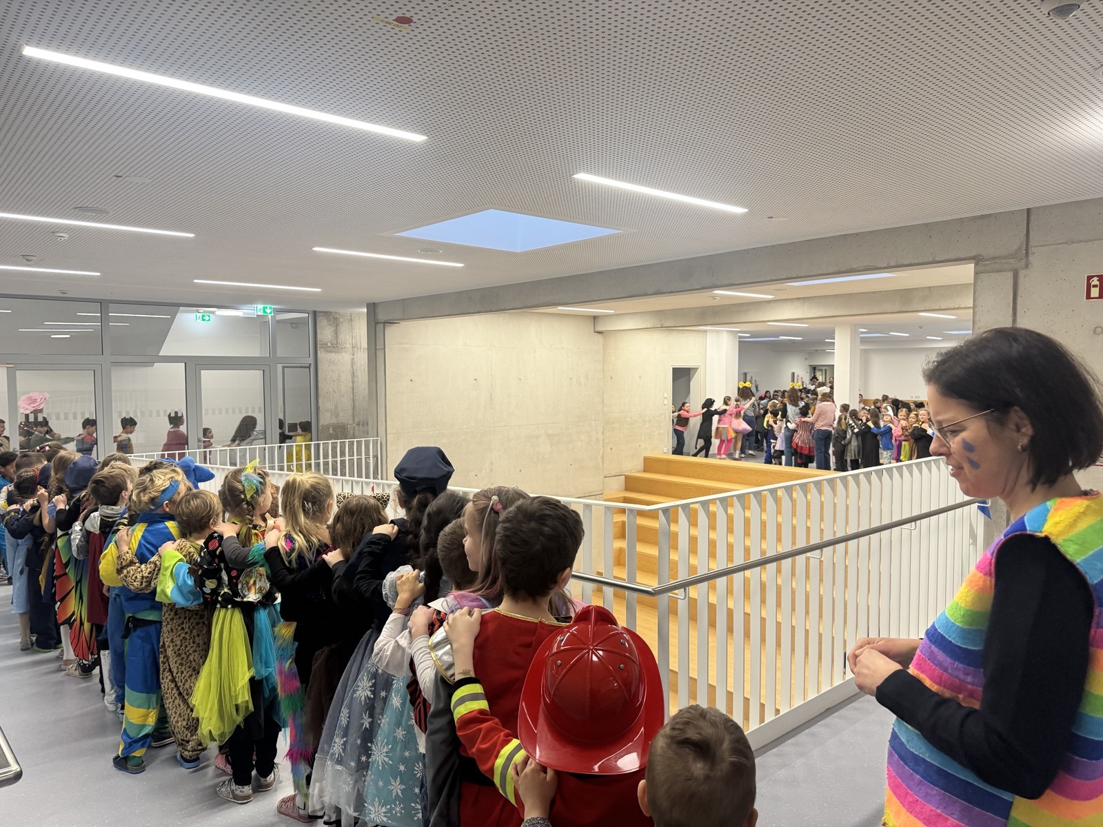 Das Highlight des Tages war jedoch die Polonaise mit allen Schülerinnen und Schülern, sowie den Lehrkräften durch das gesamte Schulhaus! Zur Musik durch den Lautsprecher wurde dabei fröhlich gesungen und getanzt!
