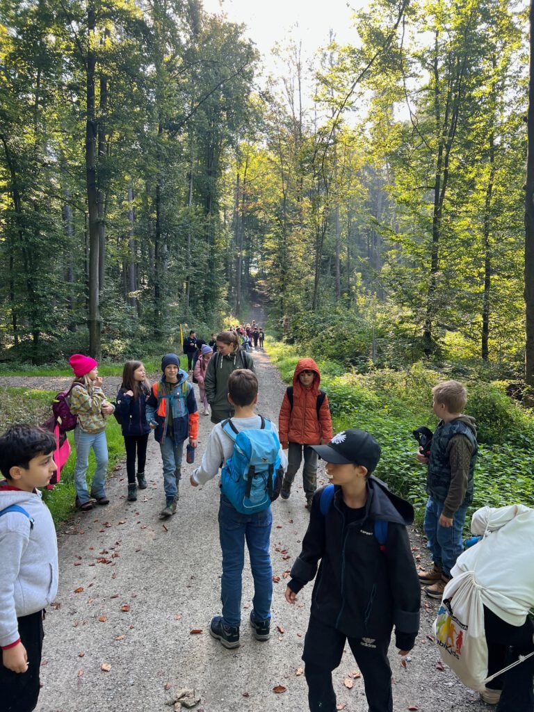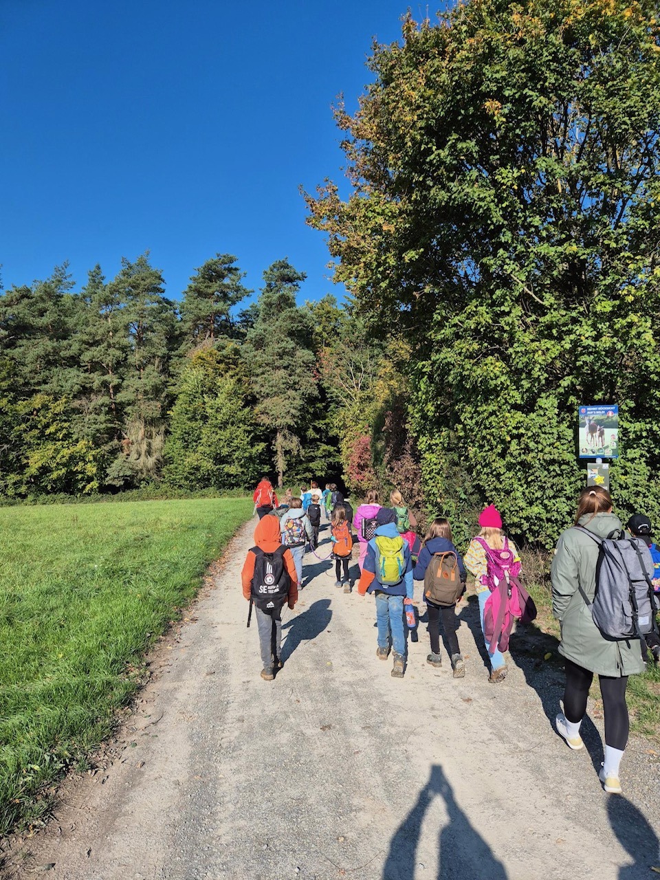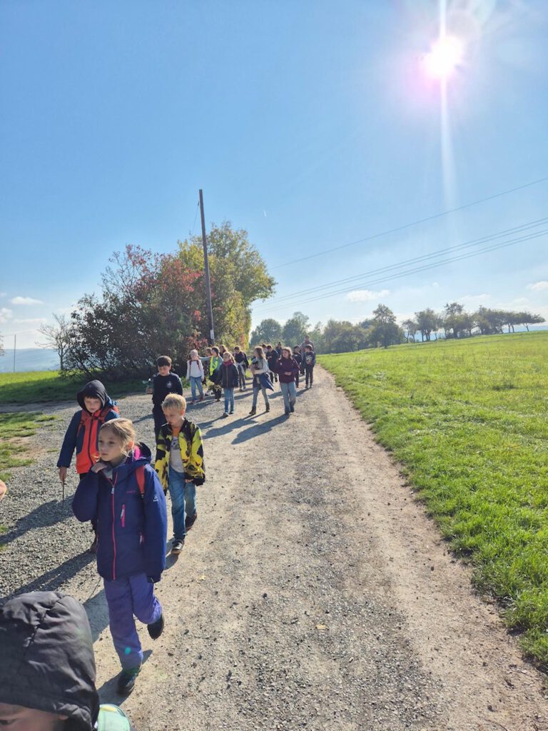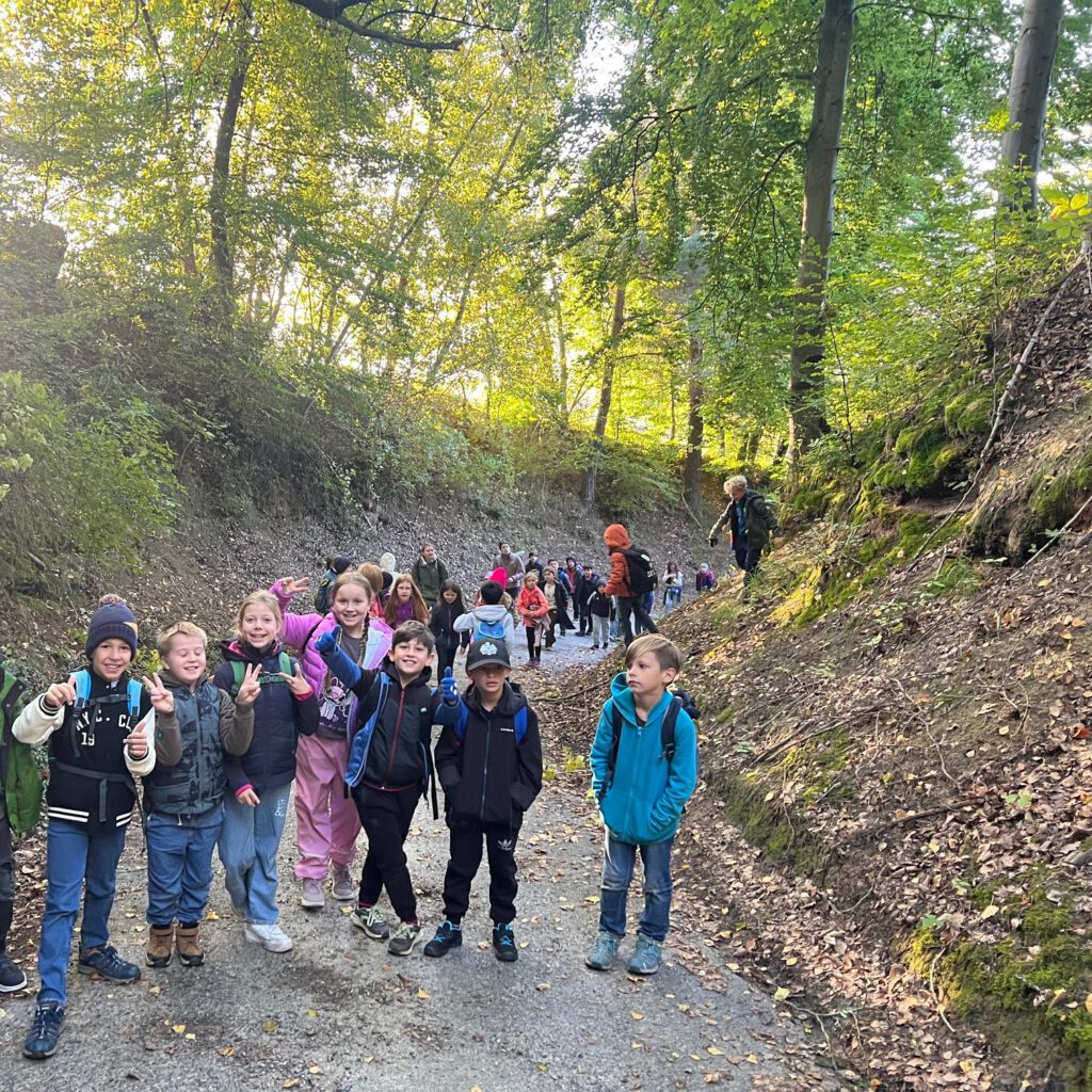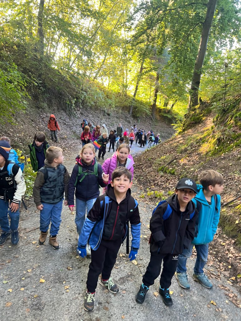 Am 2. Oktober machten sich die Klassen 3a und 3c gemeinsam auf den Weg. Bei strahlendem Sonnenschein wanderten wir über den Dormeswald zum MSC-Gelände. Dort legten wir eine gemütliche Pause ein und nutzten die Zeit, um uns auszutoben und die Natur zu genießen.Wir vergnügten uns mit verschiedenen Spielen, pflückten bunte Blumen und hatten sogar Besuch von einem freundlichen Hund, mit dem viele Kinder begeistert spielten. Nach der Pause ging es gut gelaunt weiter – unser Weg führte uns durch den Wald zurück in Richtung Schule.